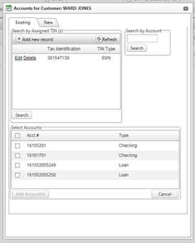 - Enter the social security number/TIN associated with the User Login and select Search. The accounts available for selection appear in the Select Accounts section