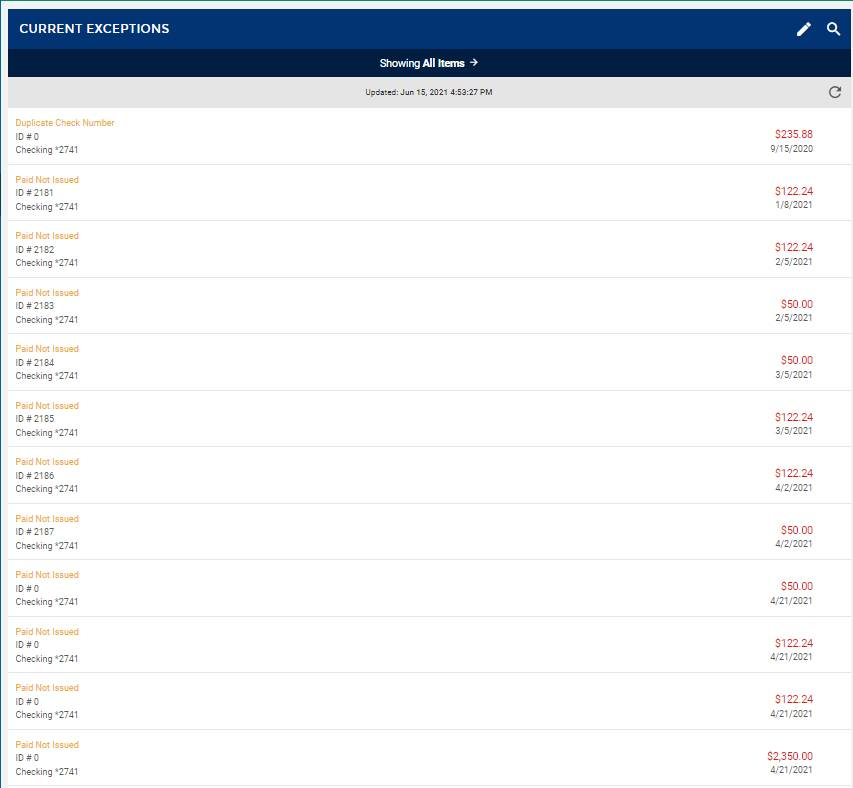 The exceptions are a listing of items that were processed in the nightly Update process but were not listed as items the customer had authorized. These items will be awaiting customer decisions on whether they are to be paid or returned.