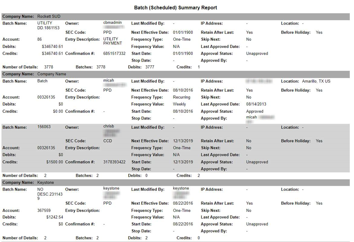 - Entry Class: all, CCD, PPD, RCK, TEL, WEB, or CTX.