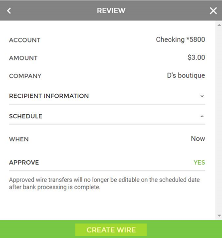 As the wire is being created, if Approve is selected, when the user clicks Create Wire, they will be required to enter authentication information.