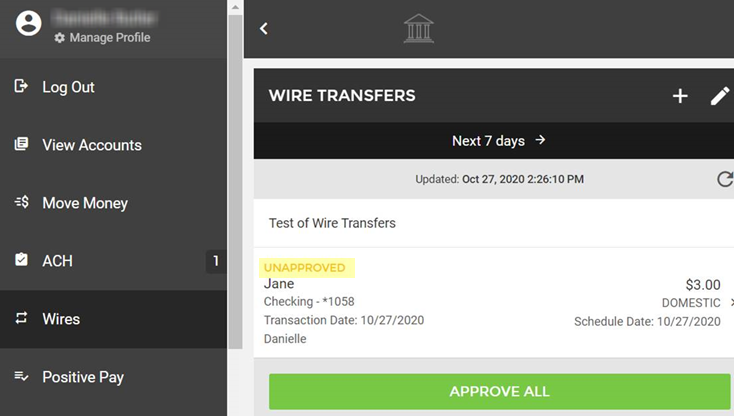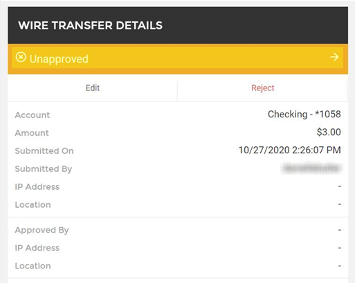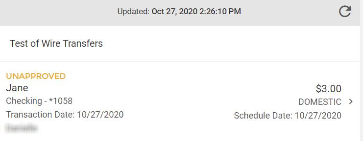 The wire will be displayed on both the wire screen and the main landing page under View Accounts >> Pending Approval. Select the wire on the landing page to access the wire transfer screen.
