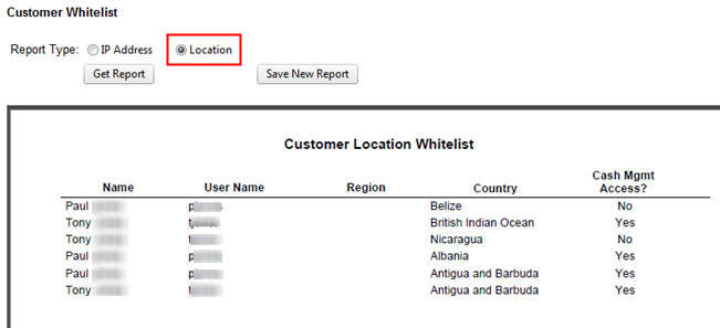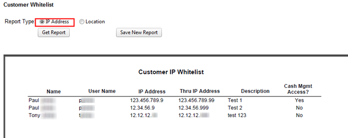 Customer whitelisting may vary from customer to customer, so the customer report displays the customer’s name and username as well. The customer report also displays whether the customer has cash management access from the IP address or location.