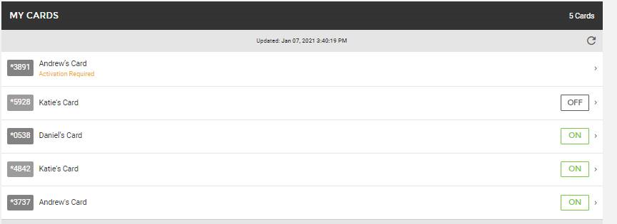 Cards can be toggled on/off from this screen by clicking the OFF/ON button.