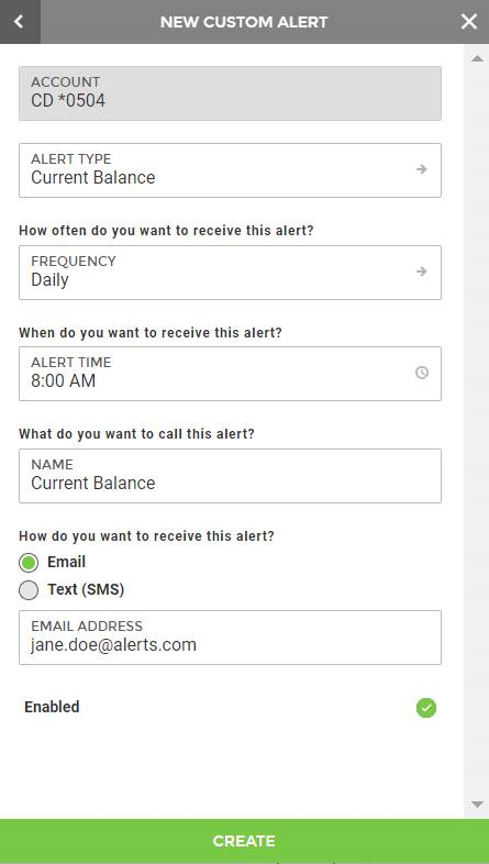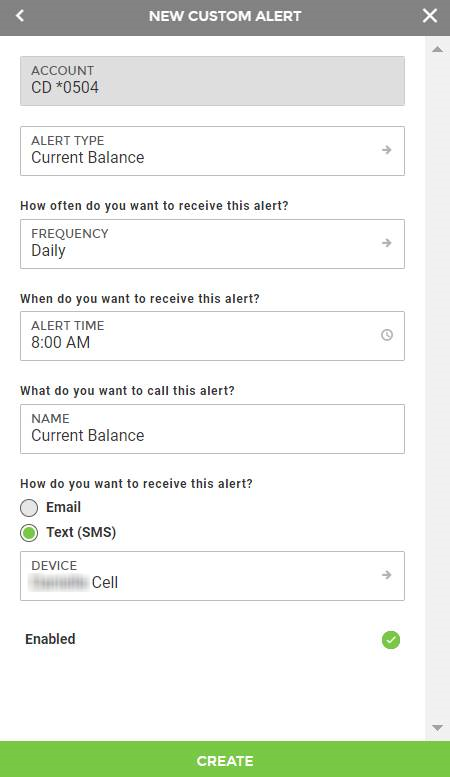 You will receive an alert on the set day of the week, displaying your current CD/IRA account balance. The frequency can be set weekly, monthly, or annually.
