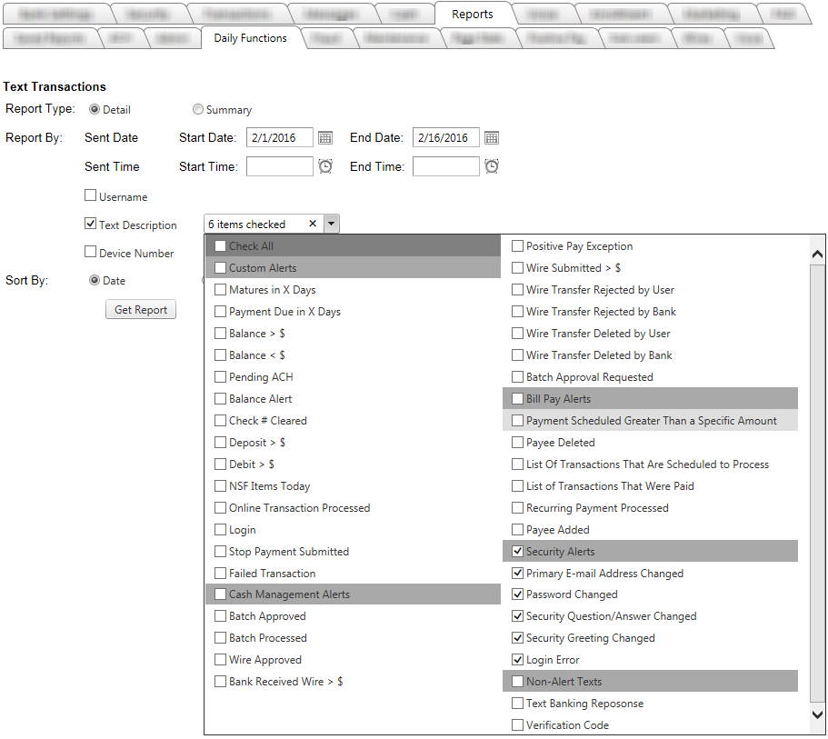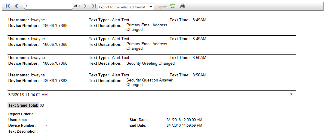 - Report Type – Summary will generate a one page summary of the text alerts without going into too much detail.