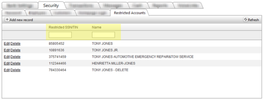 Both the Restricted SSN/TIN and name columns contain a search field that allow users to search for a specific SSN/TIN and/or name