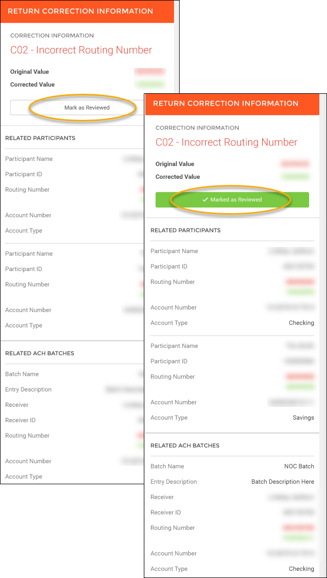 - Marking as Reviewed: The top of the Return Correction Information screen provides the reason the item was returned, as well as the Original and Corrected values.Related Participants and ACH Batches are listed below with their item information, as well as the Original and Corrected values.To mark an item as Reviewed, select the Mark as Reviewed button. The button will then change to a green Marked as Reviewed button.