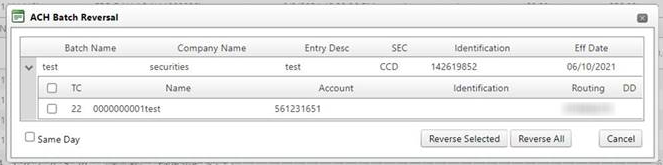 Note: The effective date of a reversal batch, not a same day batch, will be the next business day. If you are reversing an ACH batch after the Financial Institution's cut-off time, the effective date will be two business days.