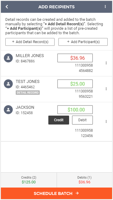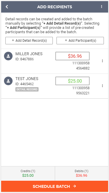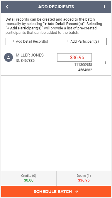 The next step in creating a new ACH batch from template is adding recipients (also known as detail records) to the batch. Since you are using a template, you may already have all the detail records already built into the batch. If not, you can add additional detail records to the batch via two different methods. The first includes the "+ Add Detail Record(s)" option, which allows the manual addition of new participants. The second includes the "+ Add Participant(s)" option, which allows you to select from a list of participants that have been built under a company.