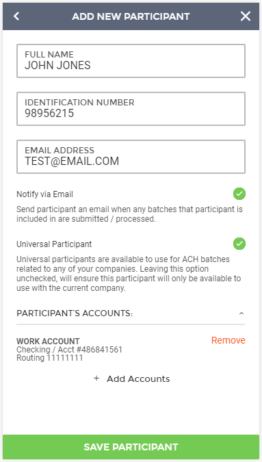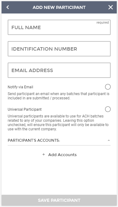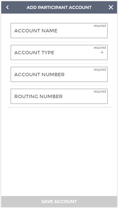 Selecting the "+ Add Accounts" button will take you to the Add Participant Account screen. Here you will enter all the account information, including:
