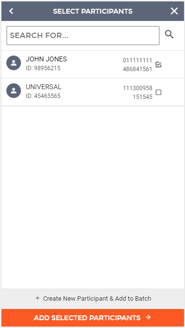 If you do not see the participant you are looking for, you can also create new participants from this screen and include them in the current batch. To accomplish this, click the "+ Create New Participant & Add to Batch" button.