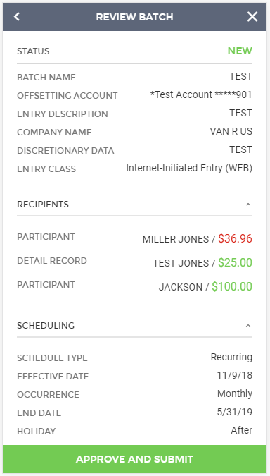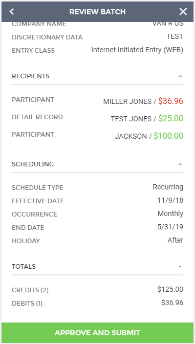 If all information contained within the review screen looks accurate, you can select to "Submit and Approve" (if you have access to approve your own batches), or to "Submit to Approver" if you require secondary approval before bank processing can occur.