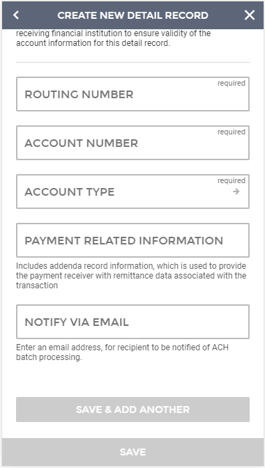 Selecting the "+ Add Detail Record(s)" option will take you to a screen where individual recipients (also known as detail records) can be added to the batch. Here you will enter all the recipient’s information, including: