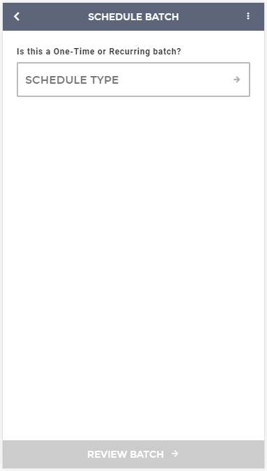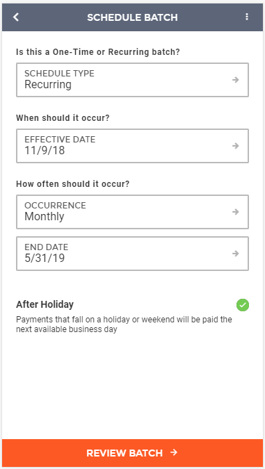 Once all detail records have been added to the ACH batch and you are ready to submit the batch, you can click the "Schedule Batch" option at the bottom of the screen. This will take you to the next screen where you can schedule the batch, determining whether you would like it to be a one-time batch or a recurring batch. On this screen you can also select the effective date and whether you would like the batch to be paid before or after a holiday or weekend if the effective date falls on one of these days. When finished, you can click on the "Review Batch" button at the bottom of the screen, which will take you to the review screen for the ACH batch.