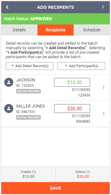 Clicking on an ACH batch from this list will take you to the ACH Batch detail screen. Here you can see the individual detail records contained within the batch, as well as various other informational fields. Near the middle of the screen, you will see the status of the batch (whether it is approved or unapproved). By clicking on the status, you can change the status to either approve or unapproved a batch. This change will be reflected on the prior screen as well as on the Overview section of the landing page.