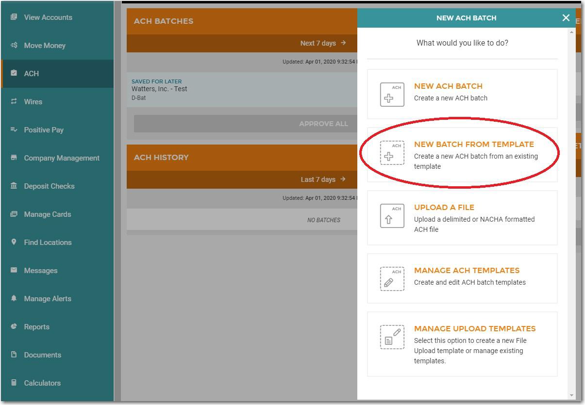 This will enable the ACH batch wizard that can guide you through various workflows including manually creating a new batch, using a previously created batch template, uploading an ACH file, or managing templates.