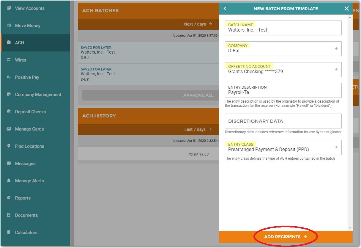 Once you have edited recipients, you will need to verify recipient amounts and transaction types (Credit or Debit – Only applicable if you can originate both transaction types).