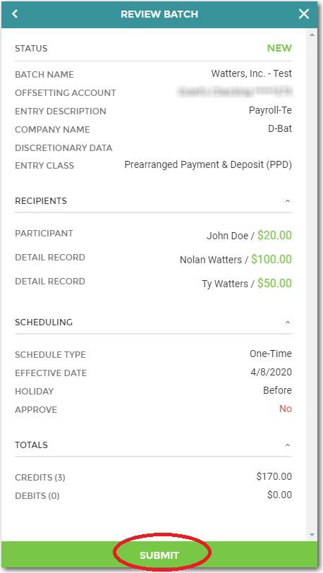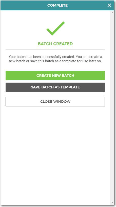 In the next step, the Review Batch screen will provide an overview of the details for the batch you’ve created.