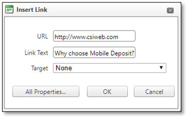 - Target: Specifies where the link will open (in a new browser window, within the mobile app, etc.).