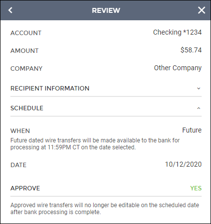 - Schedule: Is the wire going to be sent immediately (Now) or is it scheduled for a future date (Future)?
