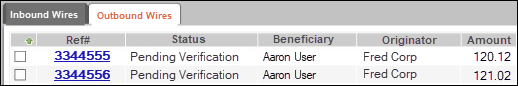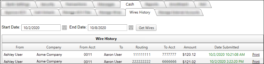 - On the Cash main-tab, Wires History sub-tab in Digital Banking Administration.