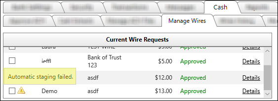 Wires that cannot be automatically transmitted will require further attention. You can find these wires on the Cash >> Manage Wires tab. Once the issue has been resolved, it must be manually submitted to WatchDOG Wire.