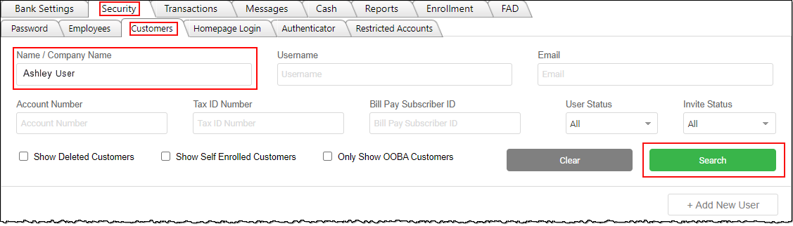 - From the Security Tab >> Customers Sub-Tab, search for the corporate customer’s name.