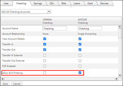 - Once you have finished making your changes, click Save. The corporate customer will now have access to the new Filtering features for the selected accounts. Any current ACH Filters set up on the account in your core system will automatically be displayed to the user.