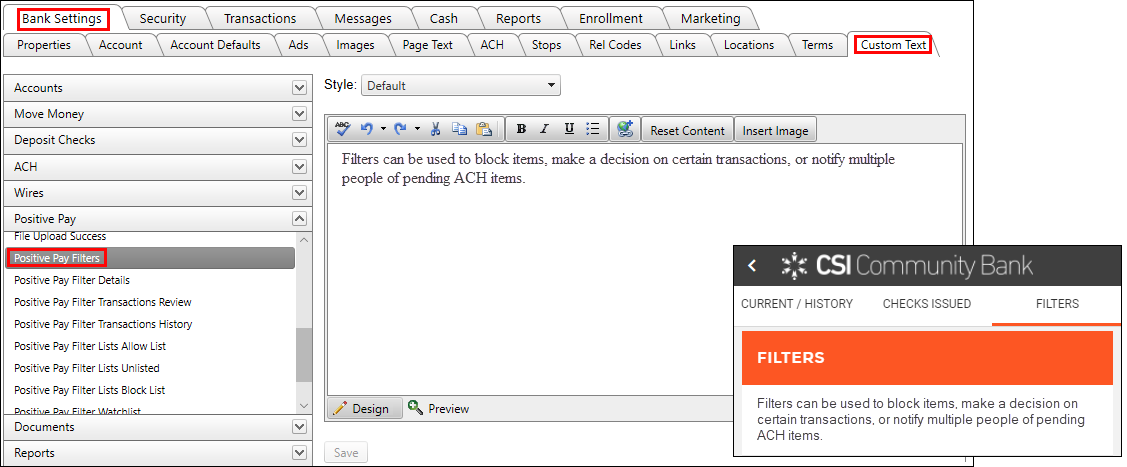 - Select the Positive Pay Filter screen you want to change, then edit the standard message displayed in the text box. Select Save. The new text will now be displayed whenever the screen is viewed in Digital Banking.