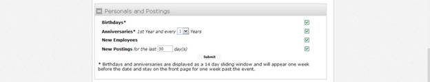 This section allows your Site Administrator to display user birthdays and anniversaries, new hires and new postings on pages within CSI Secure Connect. |