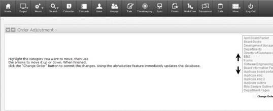 Highlight the category you want to move and click on the arrows to move it up or down in the list. To submit the changes, click the Change Order button. The new order will display the next time the current page is refreshed. Site Administrators also have the option to alphabetize the pages by clicking the Alphabetize button.