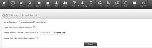 From here, your Site Administrator can enter a hypertext link or browse for a replacement file. It is also here where the entire page can be deleted from Site Navigation. When finished making changes, click the Submit button.