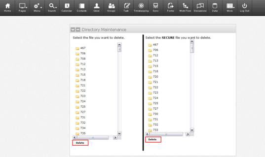 If a file is deleted from CSI Secure Connect, the content associated with that file remains on the server until it is manually removed. This is to eliminate any issues associated with files that are linked from other pages within CSI Secure Connect. To clean up the directories, select Directory Maintenance.