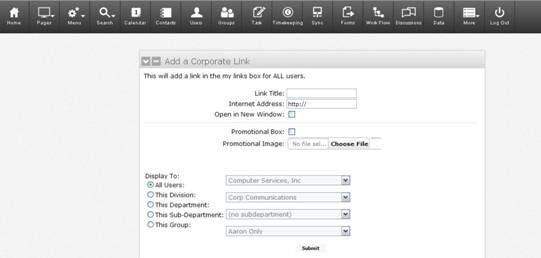 To display the corporate link to all users, click the All Users radio button. To restrict the users who see the link by division, department, sub-department or group, click the corresponding radio button and select the specific users from the dropdown list beside your desired category.