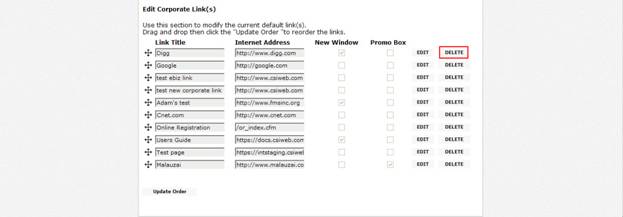 To delete any of the current corporate links, click the Delete button at the end of the appropriate row. The link you deleted will immediately be removed from the list of corporate links.