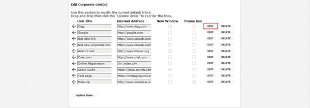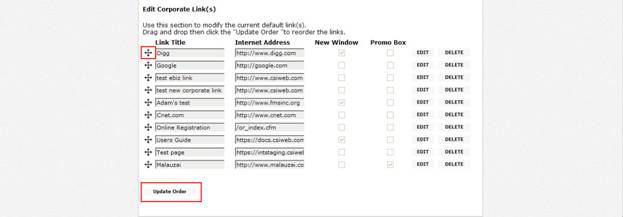 The list of corporate links can be customized to appear in any order your Site Administrator chooses. To reorder the link list, click the arrow icon in front of any link row, and drag and drop the links into the order you want. Once you have finished reordering the list of corporate links, click Update Order. The links will now appear in the newly edited order on the CSI Secure Connect Home Page.