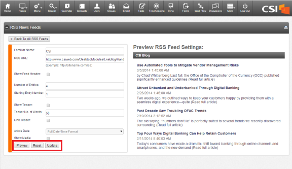 Preview will allow you to see a preview of your RSS Feed as it will appear. Reset will revert your changes back to the default settings. Click Update once you are finished to save your changes.