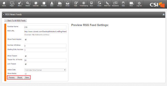 Click Preview to see how your RSS Feed will appear on the home page. The Reset button will revert all of your work back to the default settings. Click Save to save your work.