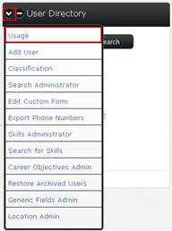 To view the Intranet Usage Report, click the dropdown arrow at the top of the User Directory box and select Usage from the menu.